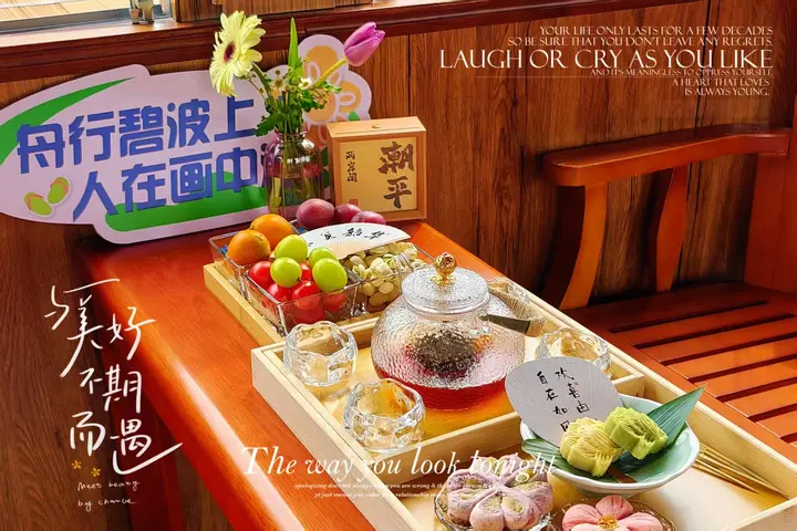 除优惠举措外,活动特别推出节日专享定制服务。游客可预约专属航线,泛舟金山湖,近距离欣赏江河交汇的湖光水色。船上设置非遗手作体验项目,包括竹编画创作、宋锦饰品制作、冰箱贴DIY等,并配有精致点心、时令水果和特色茶饮,让游客在品茗观景间,体验传统文化魅力。