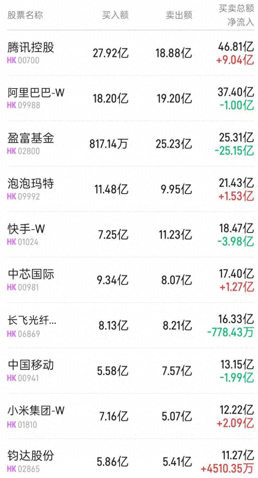 此外,阿里巴巴-W(09988)、泡泡玛特(09992)分别获净买入5041万、3713万港元。而中国移动(00941)遭净卖出1.99亿港元。